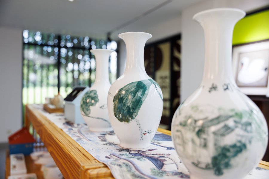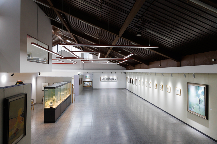 现代会议厅与静谧茶室相得益彰,专设的画室成为艺术家创作基地。“主展厅正在展出‘吴爱政荷花艺术展’,主题是在莲湖村随处可见的荷花”,黄闰生介绍说,莲湖村物产丰饶,菱角、大米、荷花、石桥、水杉……数不尽的风物,随着季节变化,可以提炼出各种各样的艺术表达,美术馆不仅能为本土艺术家提供展览空间,更能成为灵感迸发落地的地方。