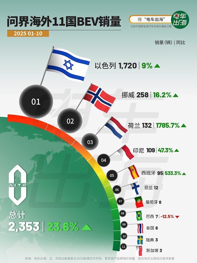 今年1-10月,以色列依旧是问界最稳的基本盘,销量1720台,小幅上涨;荷兰今年起势,从去年的7台直接跳到132台;西班牙也从15 升到95台;挪威依旧是高认可度的北欧阵地,小幅增长到258台。