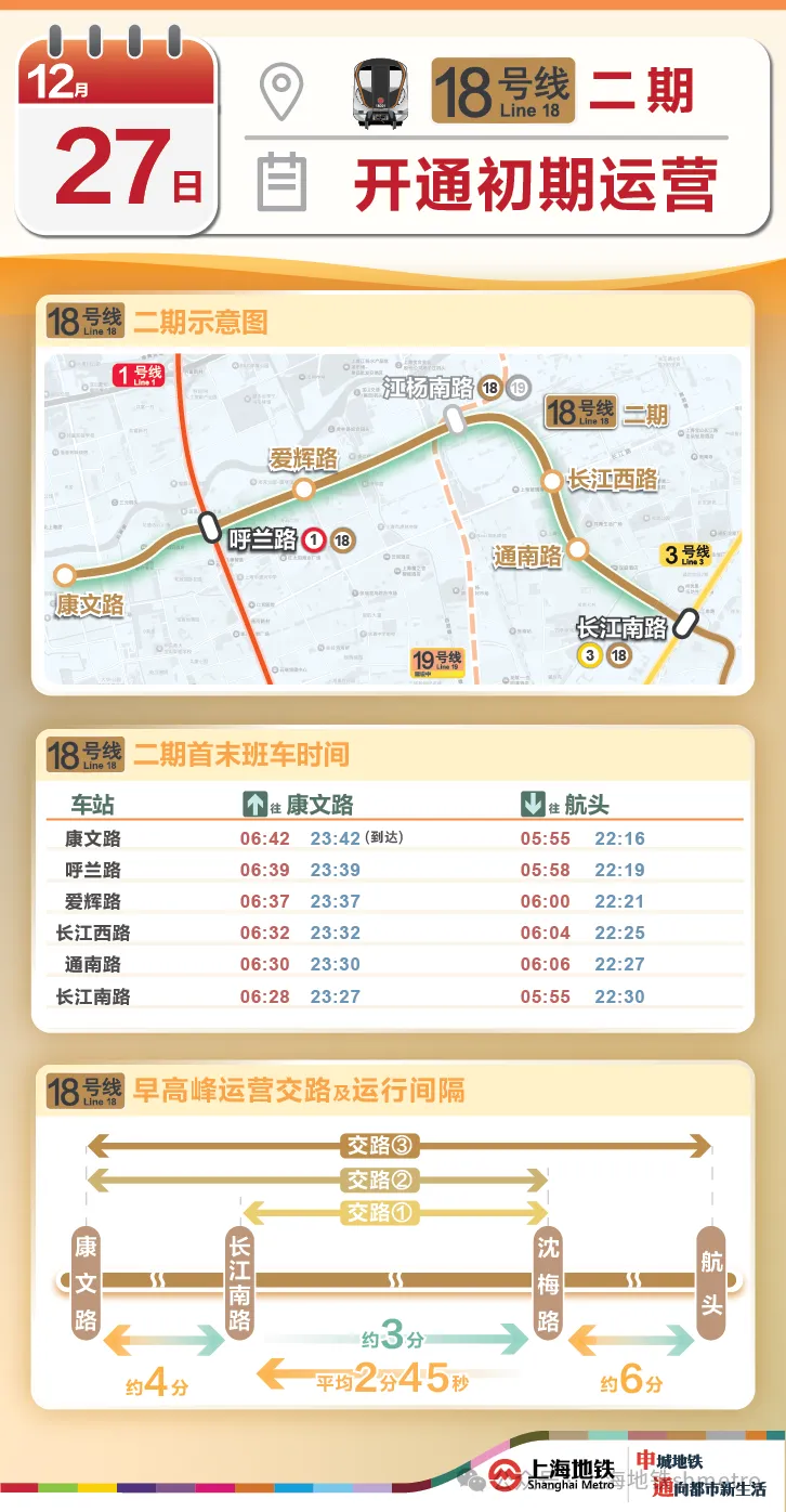 希望地铁方能看到网友的这些反馈考虑一下网友们的建议哦~说到地铁18号线今天有个重磅好消息!许多人期待的18号线二期就在明天(12月27日)开通运营啦!申通地铁集团介绍,12月27日(周六)首班车起,18号线二期工程将开通初期运营。该线路东起于一期工程长江南路站,西止于康文路站。
