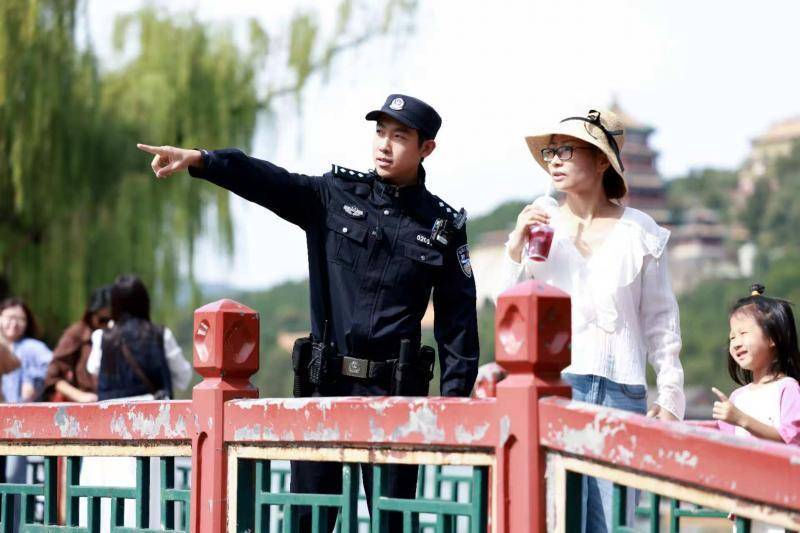 高架椅旁,杜鲲鹏的同事正在为游客指路。杜鲲鹏看到一个小男孩正独自在东宫门广场上走动,连忙跑过去拉住小男孩询问:“小朋友,你的爸爸妈妈呢?”不远处,正在拍照留念的夫妻俩这才惊觉孩子没在身边,急忙赶过来。杜鲲鹏叮嘱他们要看好孩子。“综合往年颐和园国庆假期情况,我们在东宫门、排云门、长廊等重点点位,增设了高架椅和遮阳伞,既能‘登高望远’观察人流动态,又方便为游客提供帮助。”海淀分局治安支队民警王一栋介绍,分局聚焦公园景区的门区、桥区、售卖活动区“三区”,观景点、打卡点、演出点“三点”,窄路、窄桥、窄门“三窄”等大人流风险点位,综合运用单行、限流、交替放行等措施,确保人流有序行进。