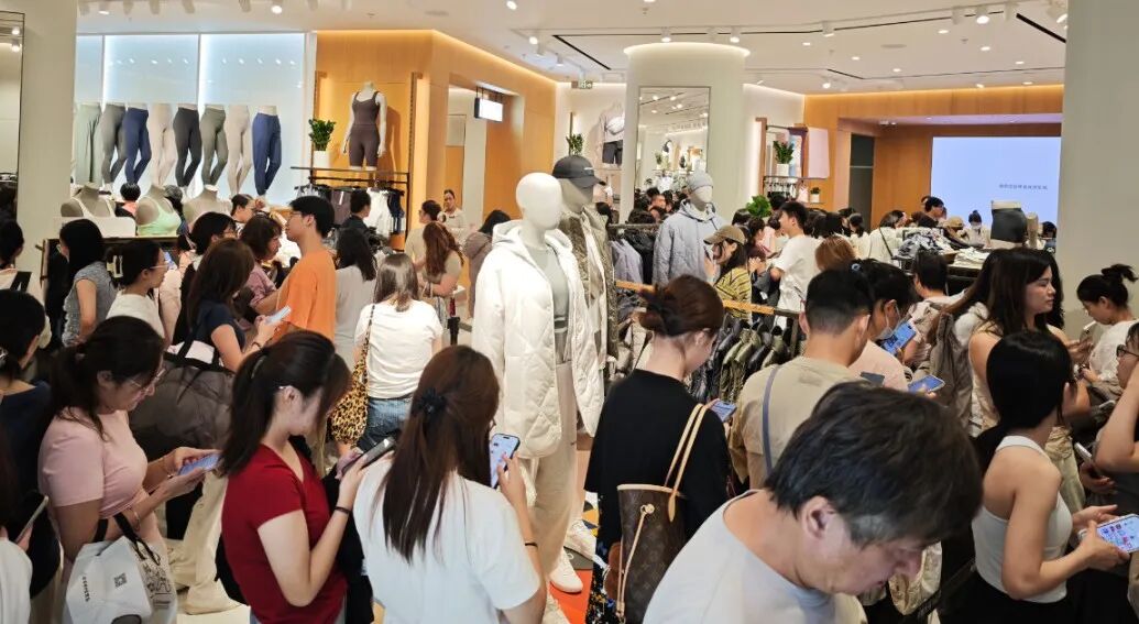 开业当日,门店外早早排起百米长队,不少消费者从别的区专程赶来。上午10点正式营业后,客流如潮水般涌入,瑜伽垫展示区、新品试穿区迅速被围得水泄不通。试衣间前持续排起长队,有顾客笑称“结账排队时间够做一组平板支撑”。